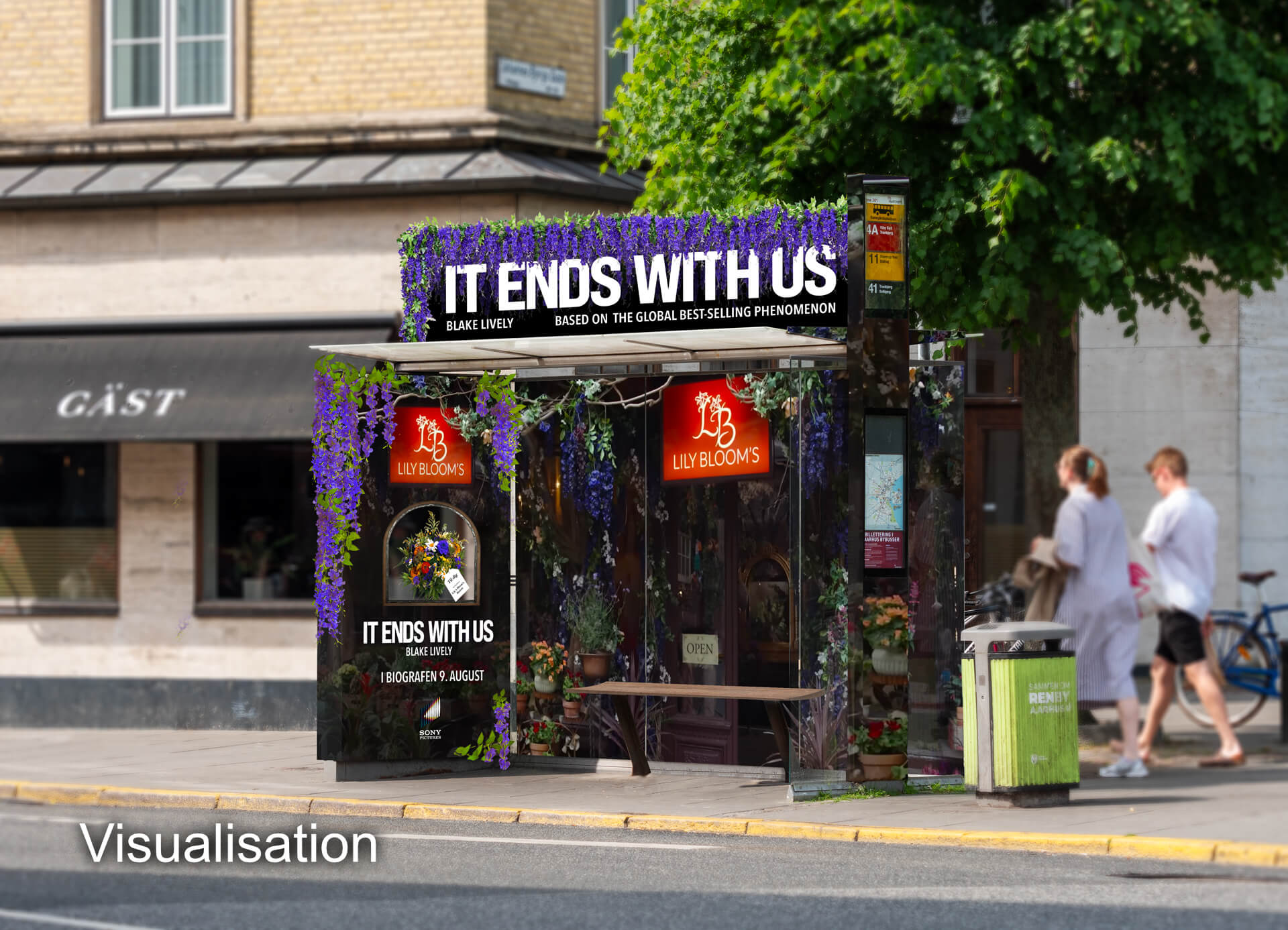 Concept Development · Brand Activation · Visualisation · Video Production While working at AFA JCDecaux, I collaborated with the Brand Activation team on a campaign for SF Studios promoting the film It Ends With Us. The Brief SF Studios wanted to create a brand activation in the public space that could bring the film’s story into a real-world environment and engage passersby. Since the main character, Lily, owns a flower shop in the film, we developed the idea of transforming a Copenhagen bus shelter into “Lily’s Flower Shop.” Concept & Activation The solution turned the shelter into a small floral display where people passing by could receive a bouquet — connecting the film’s narrative with a tangible brand experience. By sampling flowers directly from the installation, the activation encouraged interaction while creating a memorable moment linked to the film’s central theme. My Role I contributed to the concept development and helped shape how the installation could translate the film’s universe into a real urban setting. I was also responsible for creating visualisations and mockups that illustrated the concept and presentation for the client. While SF Studios ultimately produced the final artwork themselves, they adopted the core activation idea — sampling bouquets inspired by Lily’s flower shop. In addition, I produced the campaign video showcasing the final installation. This included directing colleagues as on-screen participants, filming on location, and editing the final video in post-production. The client was very pleased with the activation, and the campaign video received strong engagement when shared online, including on LinkedIn. Below is the visualisation I created based on our concept proposal for the client, followed by the campaign video showcasing the final installation. The video was produced by me to document and present the completed activation.