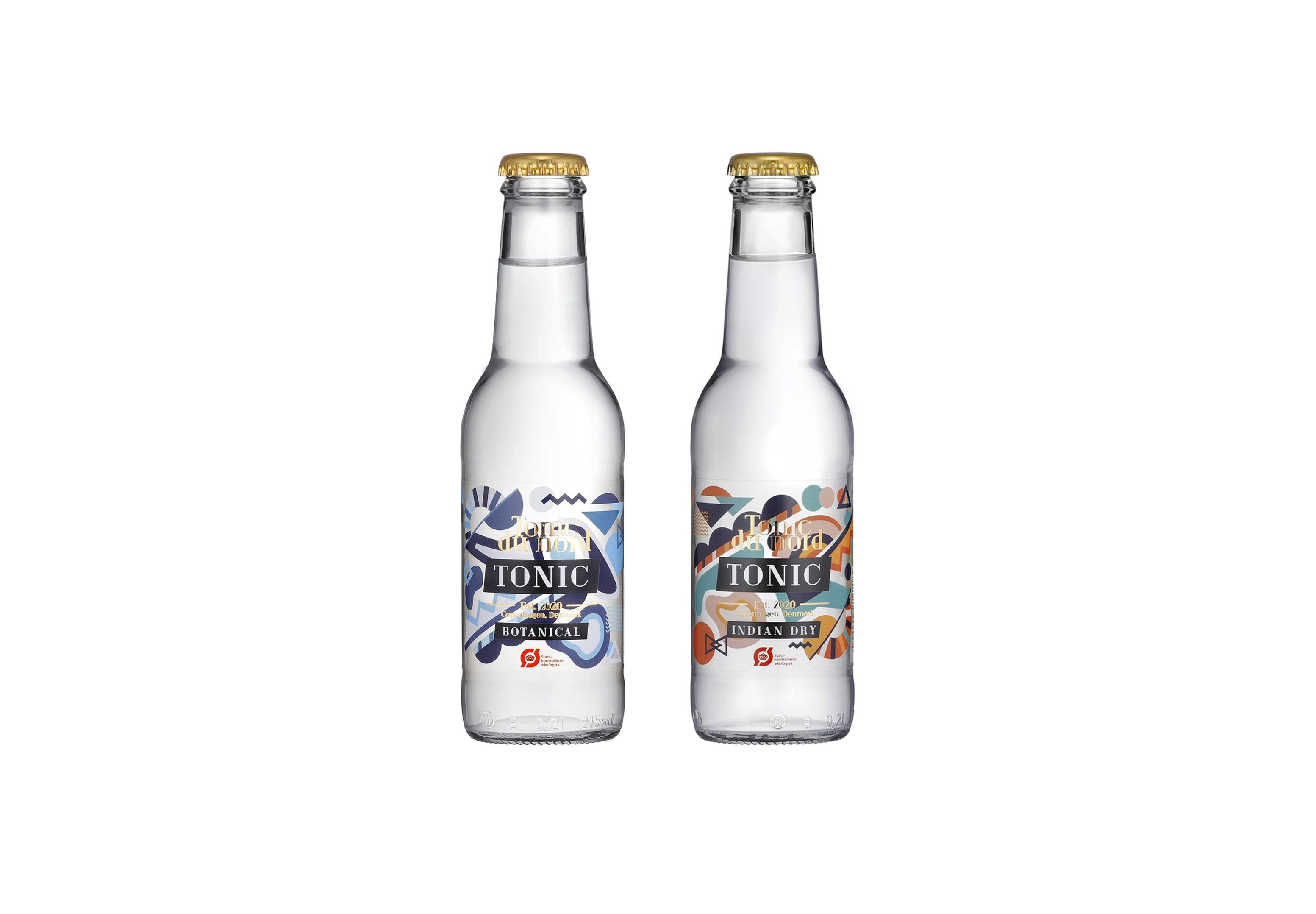 Logo Design · Branding · Label Design I designed this label for a Danish organic tonic. The client wanted a more artistic design featuring various shapes and forms in different colors. It all started with the Indian Dry, which required extensive sketching, hours in Illustrator, and multiple test prints until we achieved the desired look and feel. Shortly after the Indian Dry was released in stores and various restaurants, we began working on the design for another flavor profile due to increasing demand.